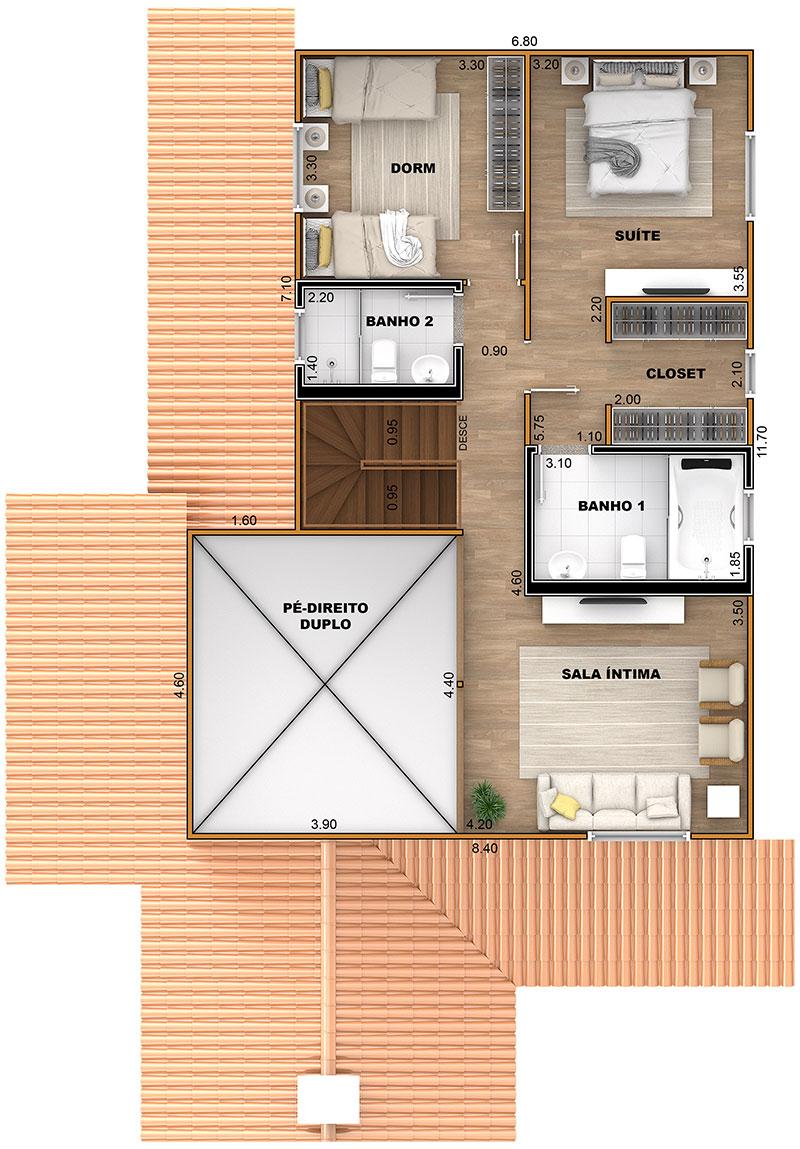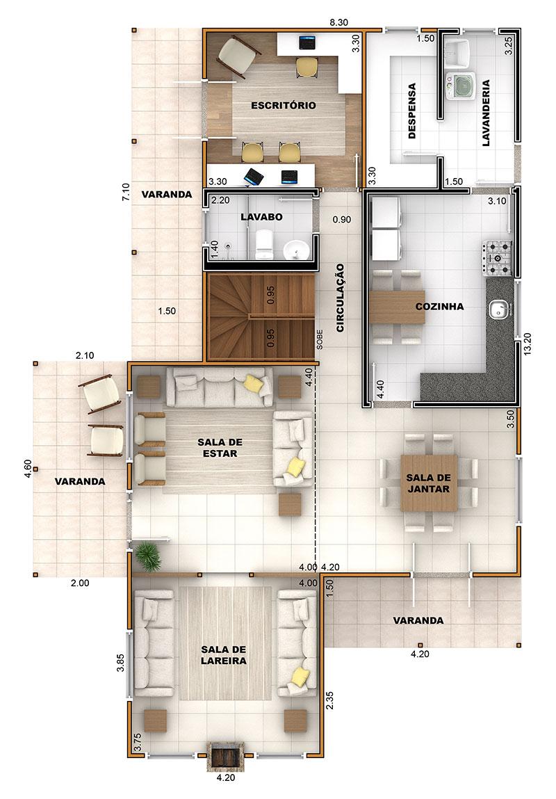 Nessa planta são quatro salas distintas e bastante espaçosas: sala de estar, sala de jantar, sala íntima e sala da lareira.